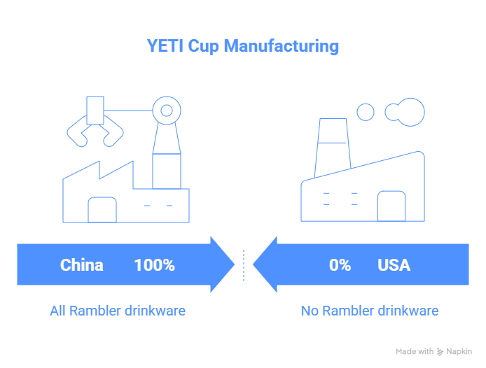 No, YETI cups are not made in the USA. All YETI Rambler drinkware—including tumblers, mugs, and water bottles—is manufactured in China. You can verify this yourself by checking the bottom of any YETI cup, where it clearly states “Designed in Austin, TX – Made in China.” The company is transparent about this on product packaging and its official website.